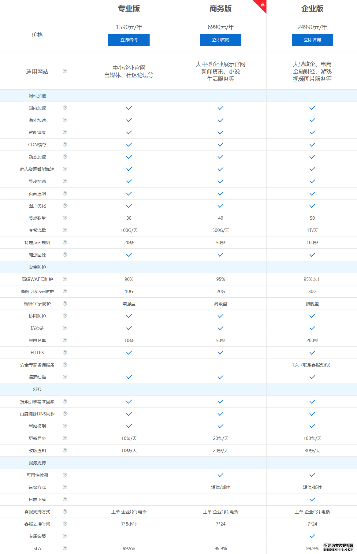 | 企業版 | 電商、金融、企業站 | 50個 | 1T/天 | 30W QPS | 30G | 100條/天 | 7 x 24專屬客服 | 99.9% | 24990/年 |