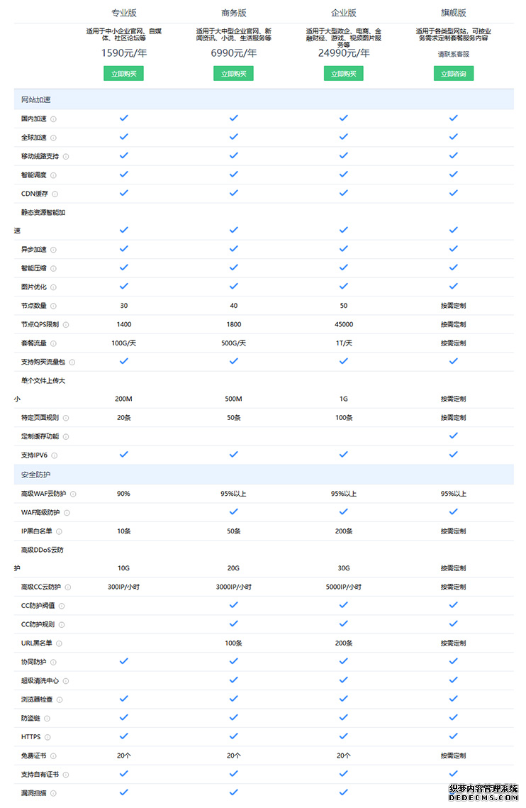 | 產(chǎn)品類型 | 適用網(wǎng)站 | CDN節(jié)點(diǎn) | 套餐流量 | CC防護(hù) | DDoS防護(hù) | SEO更新同步 | 客戶支持 | SLA可用性 | 價(jià)格 |