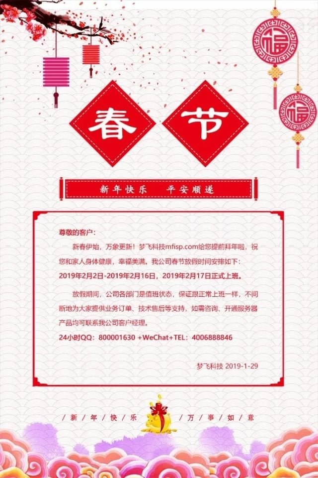 春節放假期間,公司客服中心、技術支持及數據中心正常值班,7*24小時全天候服務,不間斷地為大家提供業務訂單、技術售后等支持,如需咨詢、開通服務器產品均可聯系公司客戶經理。